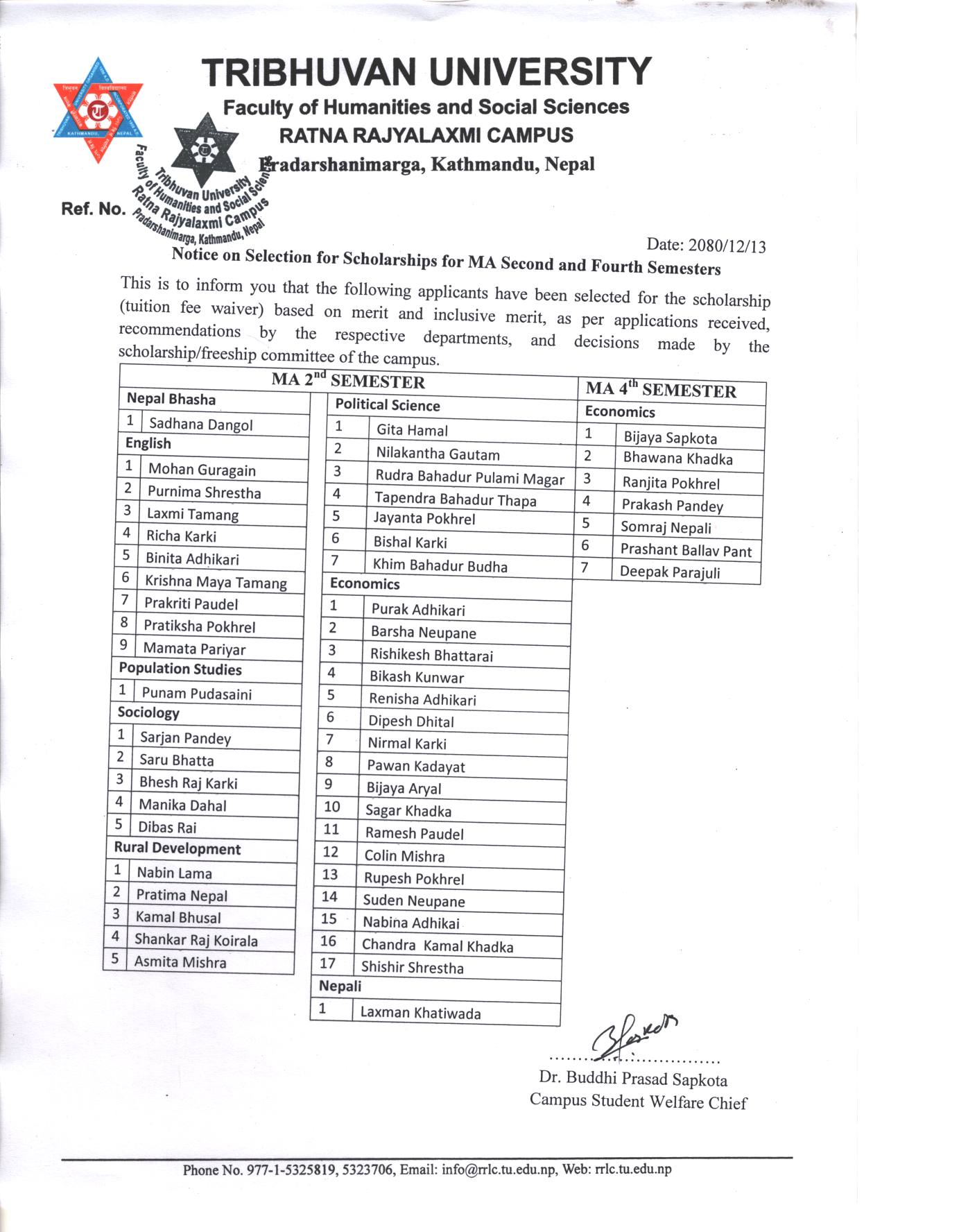 Notice on Selection for Scholarships for MA Second and Fourth Semesters |