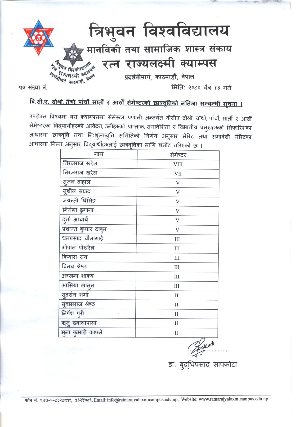 बी.सी.ए. दोस्रो, तेस्रो, पांचो. सातौं र आठौं सेमेस्टर छात्रवृत्तिको नतिजा सम्वन्धी सूचना । |