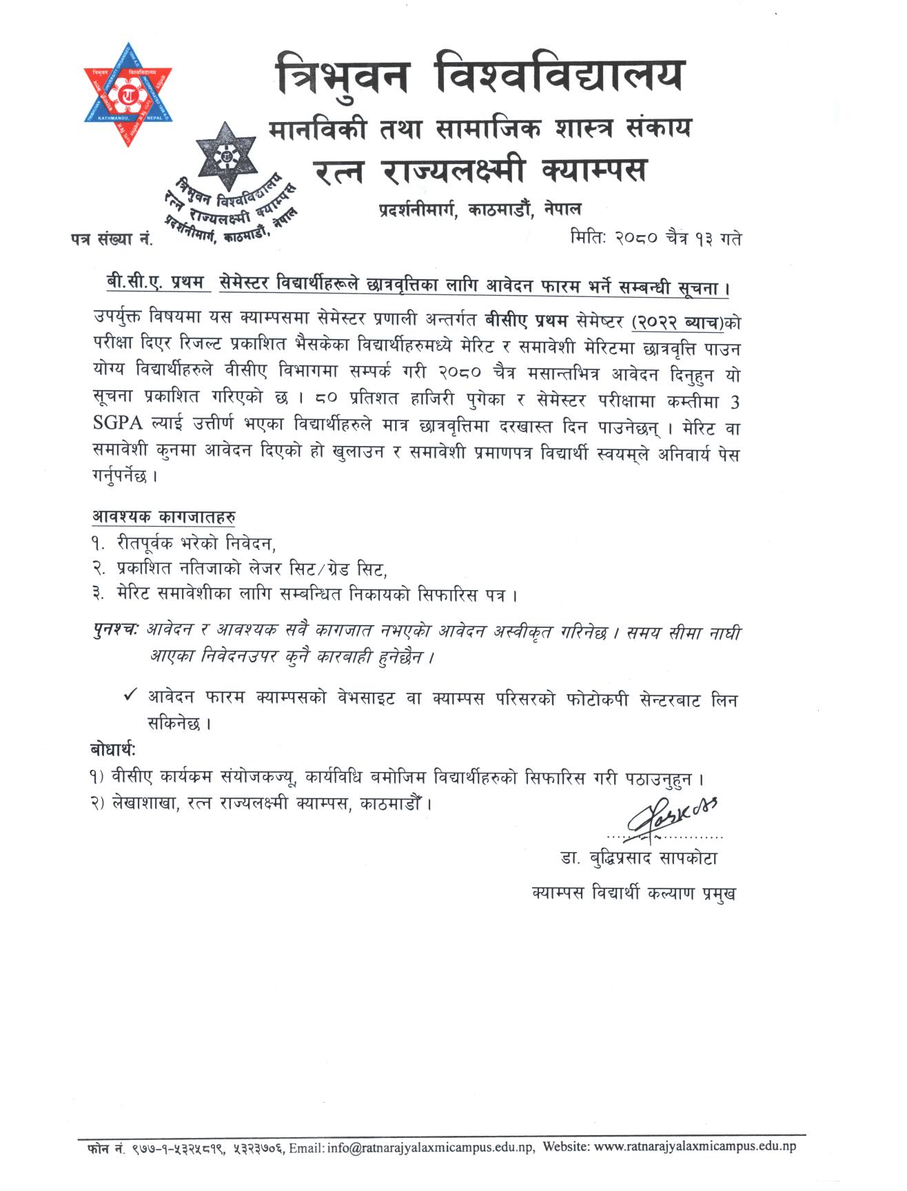 बी.सी.ए. प्रथम सेमेस्टर विद्यार्थीहरूले छात्रवृत्तिका लागि आवेदन फारम भर्ने सम्बन्धी सूचना । |