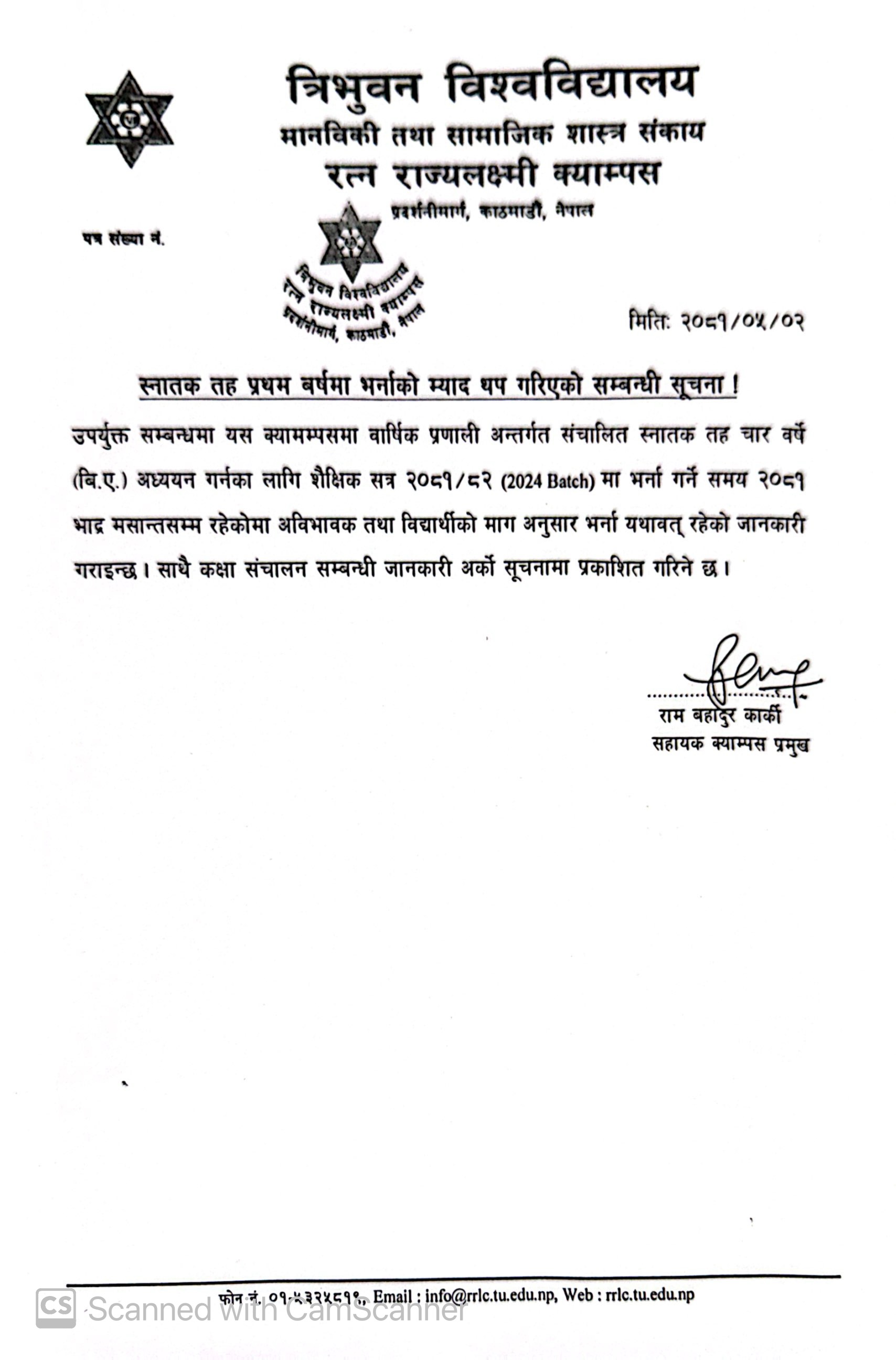 स्नातक तह तेस्रो वर्षको भर्ना सम्बन्धी सूचना