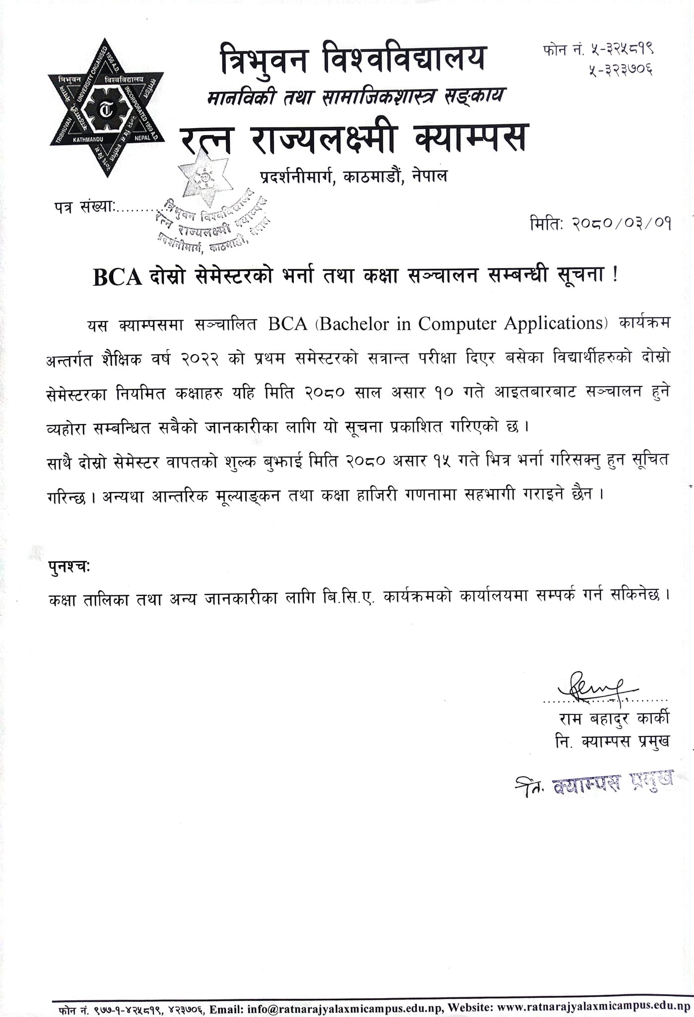 पुनश्चः कक्षा तालिका तथा अन्य जानकारीका लागि बि.सि. ए. कार्यक्रमको कार्यालयमा सम्पर्क गर्न सकिनेछ ।