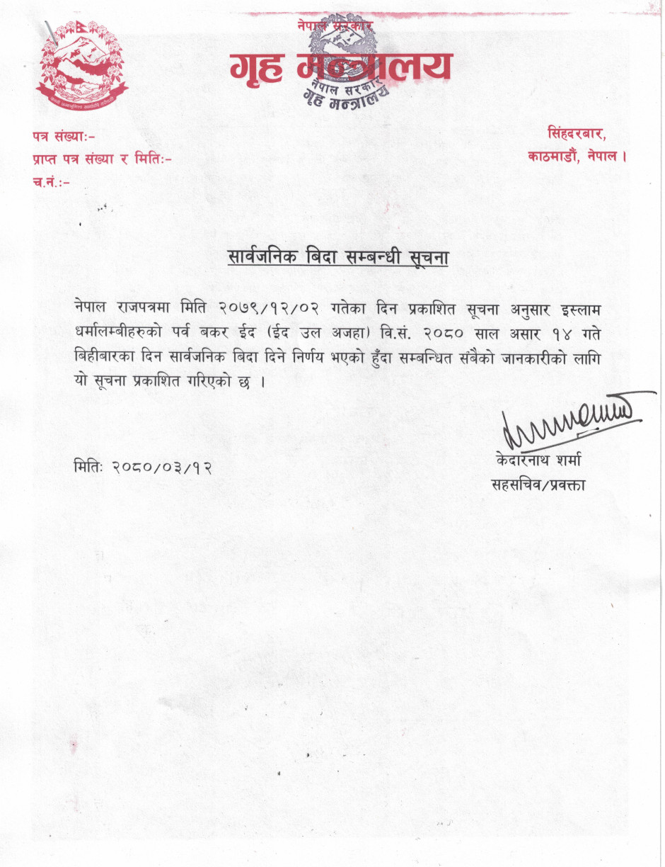 गृह मन्त्रालय को मिति २०८०/०३/१२ को सूचना अनुसार इस्लाम धर्मालम्बीहरुको पर्व बकर ईद (ईद उल अजहा) वि.सं. २०८० साल असार १४ गते बिहीबारका दिन सार्वजनिक बिदा दिने निर्णय भएको हुँदा उक्त १ दिन क्याम्पस बिदा हुने व्यहोरा सम्बन्धित सम्पूर्ण शिक्षक, कर्मचारी तथा विद्यार्थी वर्गमा सूचित गरिन्छ । साथै पूर्व निर्धारित आन्तरिक परीक्षाहरु भने यथावत सञ्चालन हुने व्यहोरा समेत जानकारी गराईन्छ ।