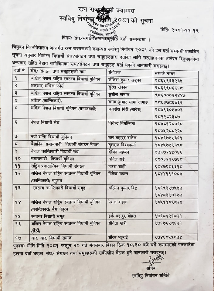 संघ/संगठन तथा समूह दर्ता सम्बन्धि स्ववियु निर्वाचन समितिको सूचना !