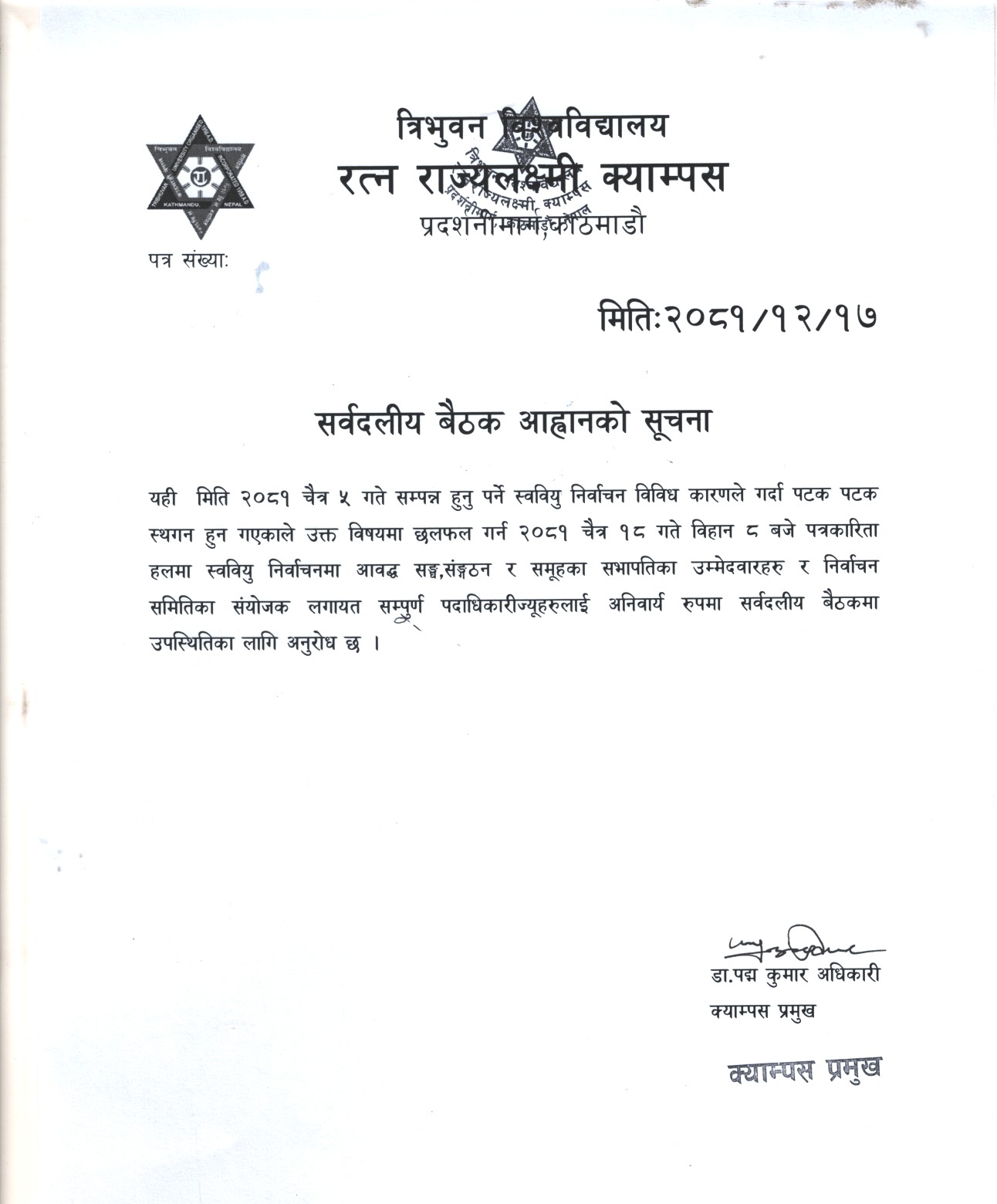 स्नातक तह तेस्रो वर्षको भर्ना सम्बन्धी सूचना