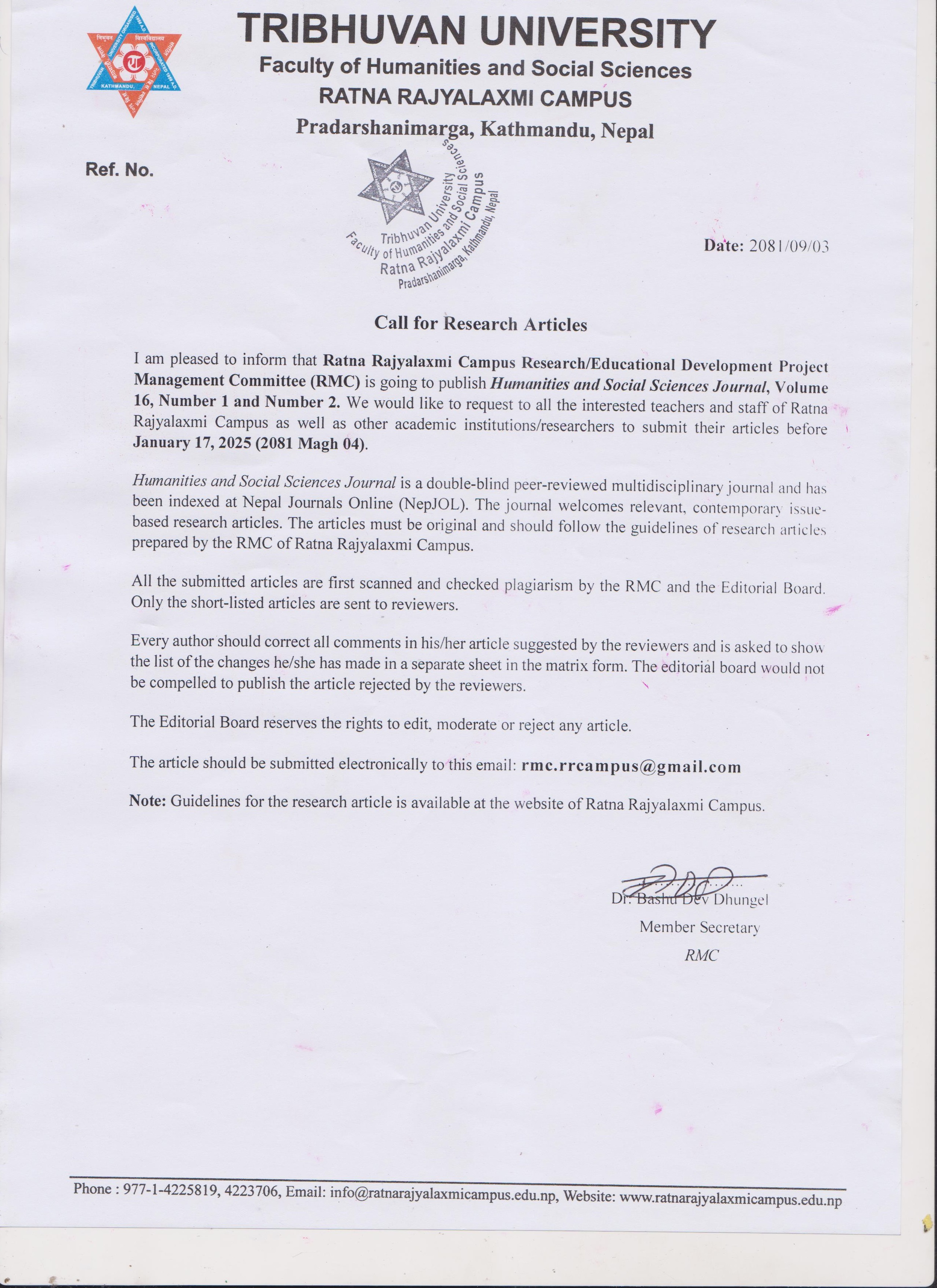 Research Management Committee (RMC) is the decision-making body regarding the research policies and strategies to promote and monitor academic research activities in academic and research institutions running within Ratna Rajyalaxmi Camous . RMC will be also responsible for coordinating with other research funding institutions.
